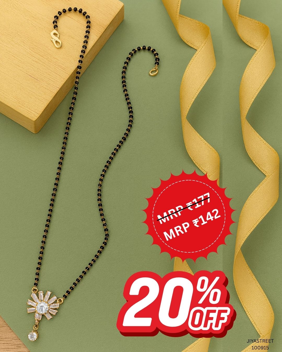 This exquisite mangalsutra blends timeless tradition with a fashionable floral design. The elegant black bead chain is accented by a brilliant, eye-catching pendant, perfect for daily wear or gifting.