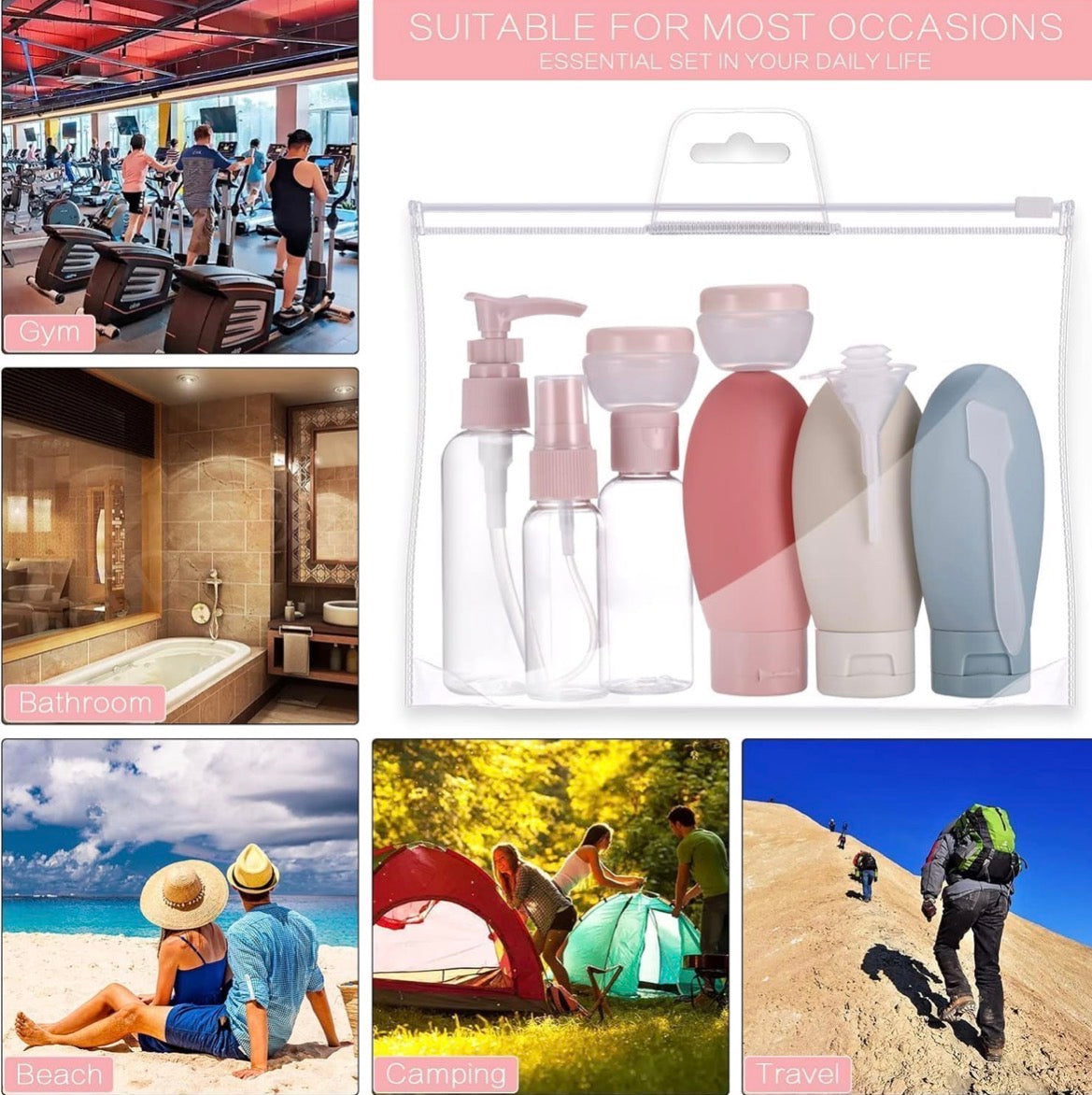 Carry your essentials without spills. This 11-piece travel bottle set is compact, leak-proof, and perfect for shampoo, lotion, skincare, and toiletries while traveling, camping, or heading to the gym.