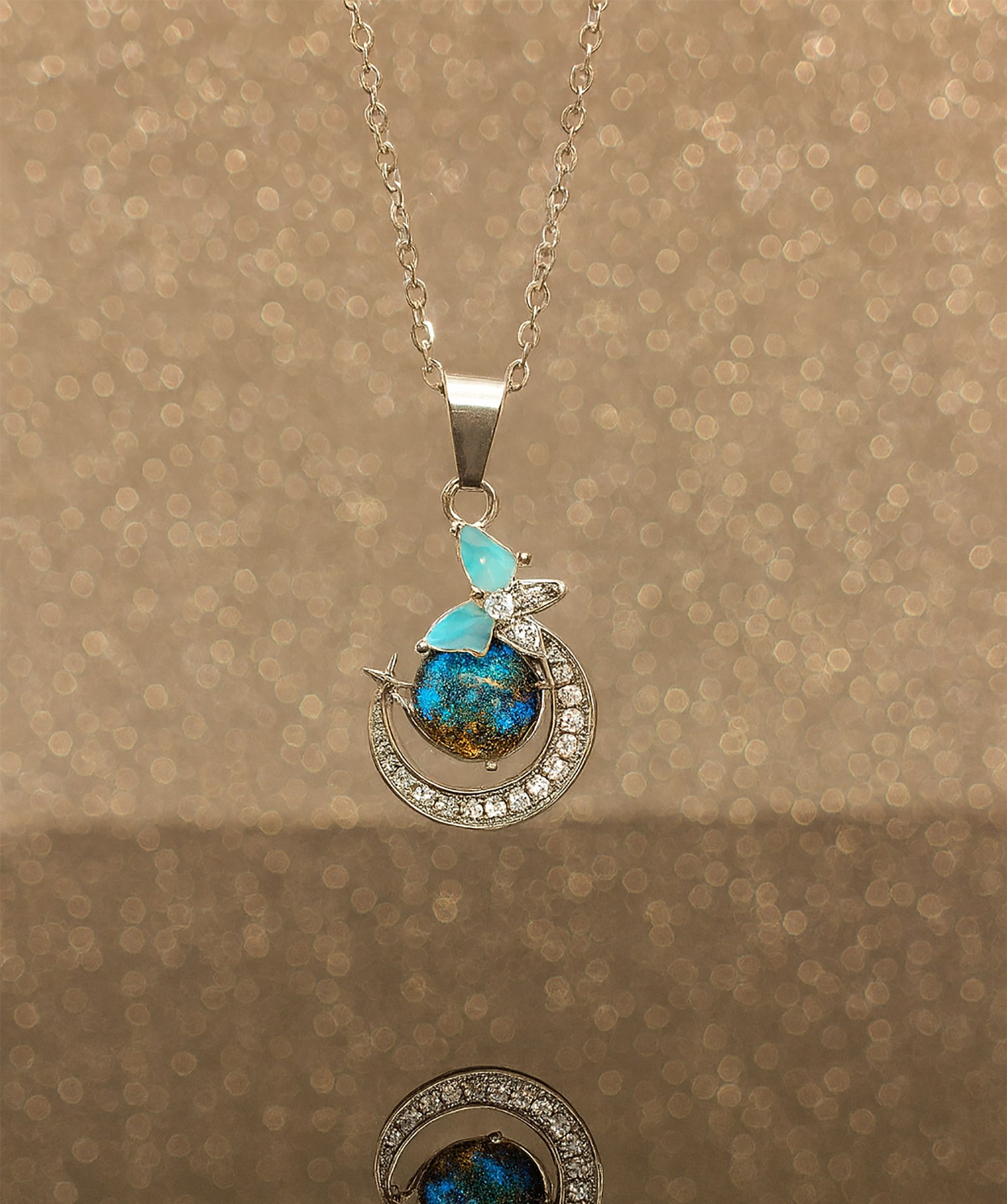 Capture the magic of the night sky with this mesmerizing pendant necklace. This piece features a unique, iridescent stone cradled within a sparkling crescent moon, accented by a delicate butterfly.