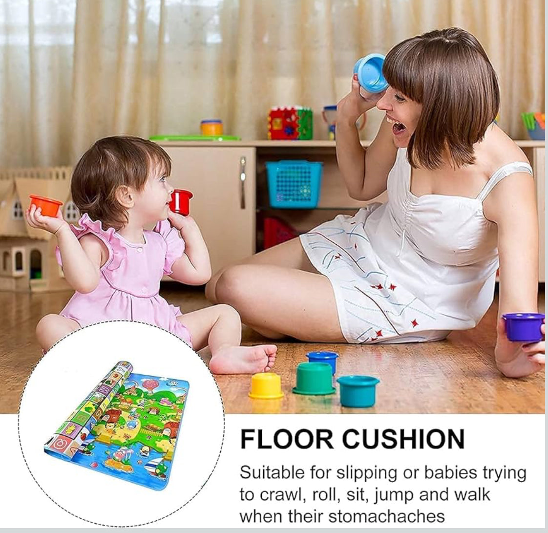 Give your baby a safe, soft, and educational play area with this Double-Sided Baby Play Mat. Made with a cushioned foam base and waterproof top layer, it protects kids from bumps, cold floors, and hard surfaces. The mat features colorful, engaging prints — alphabet, numbers, shapes, animals, and activity scenes — designed to support early learning.
