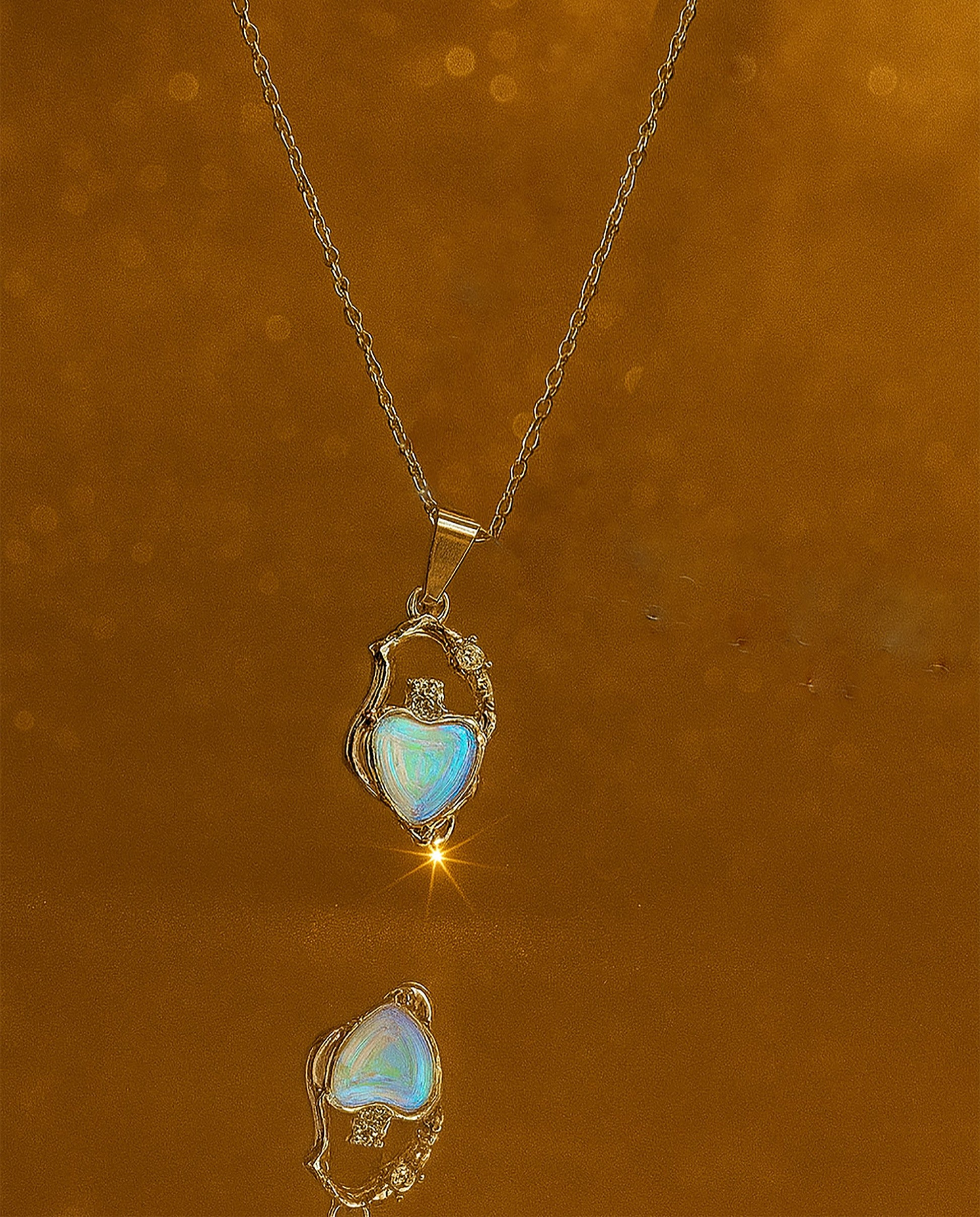 Design: Features a uniquely shaped pendant setting that holds an iridescent opal-look gemstone (likely a synthetic opal or moonstone imitation).
