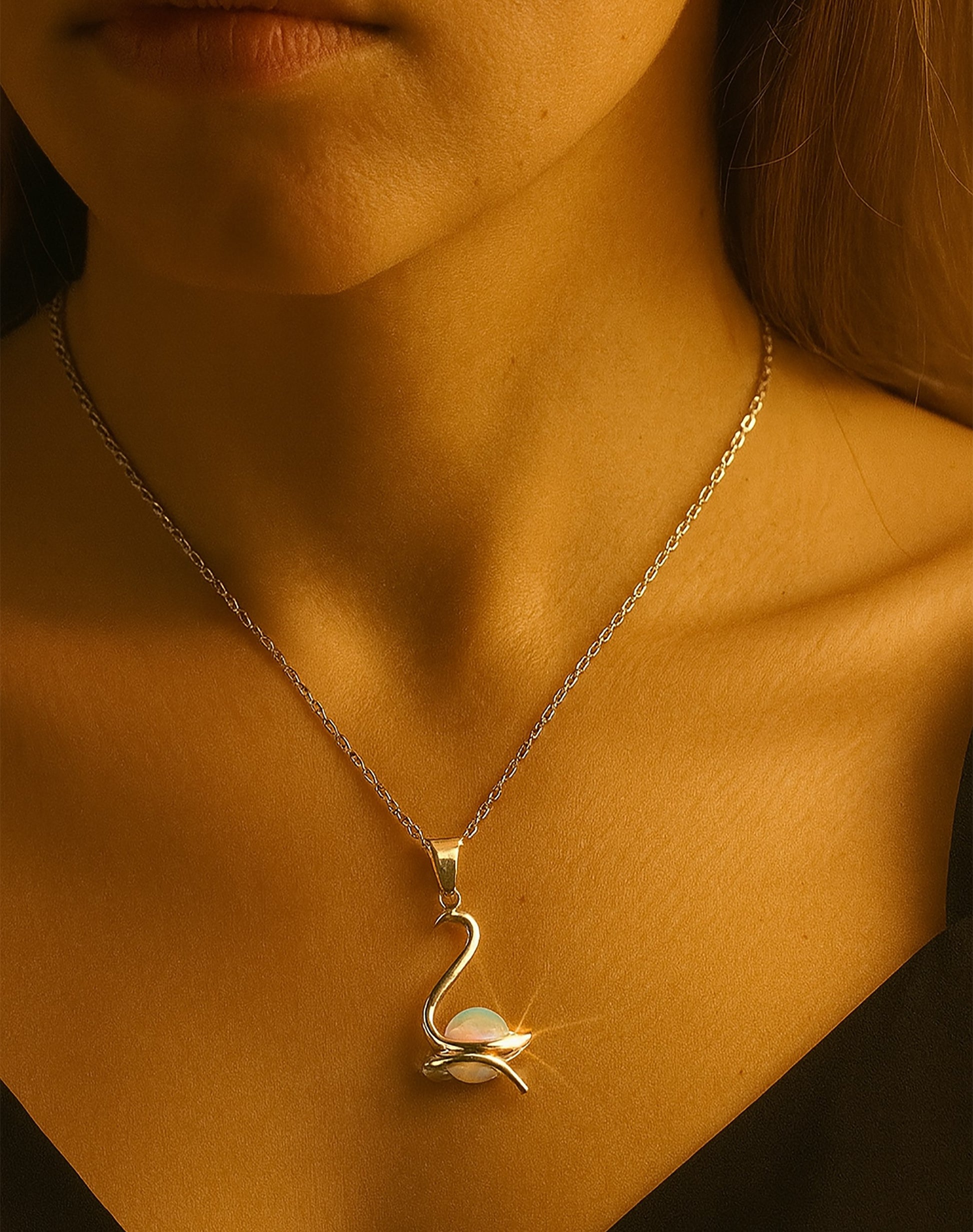 Details: The body of the swan is adorned with a smooth, polished opal-look material (similar to Necklace A), providing a subtle contrast to the silver-toned outline of the neck and wings. The design is fluid and artistic.