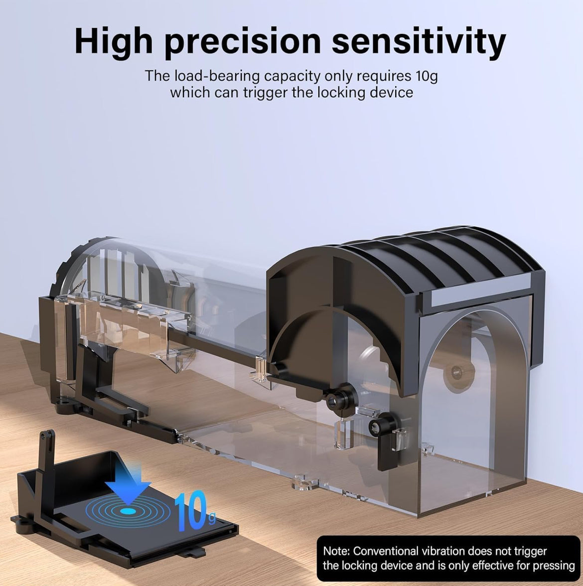 This no-kill humane mouse trap is designed to catch mice and small rats safely without harm. Built with a high-precision 10g sensitivity trigger, the trap activates instantly when the mouse steps inside—no chemicals, no electricity, no danger.