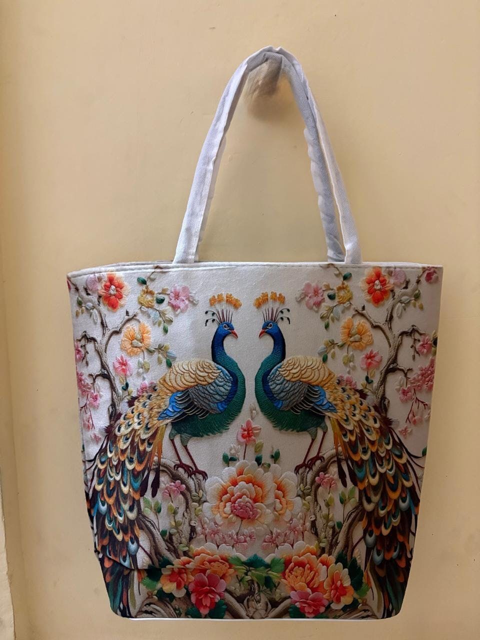 π¦ Imperial Peacock & Floral Embroidery-Style Tote Bag