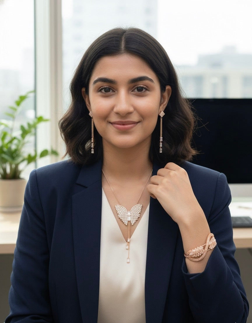 Available in two stunning finishes — Silver & Rose Gold, this set is perfect for parties, weddings, gifting, and special occasions. Lightweight, comfortable, and beautifully detailed.