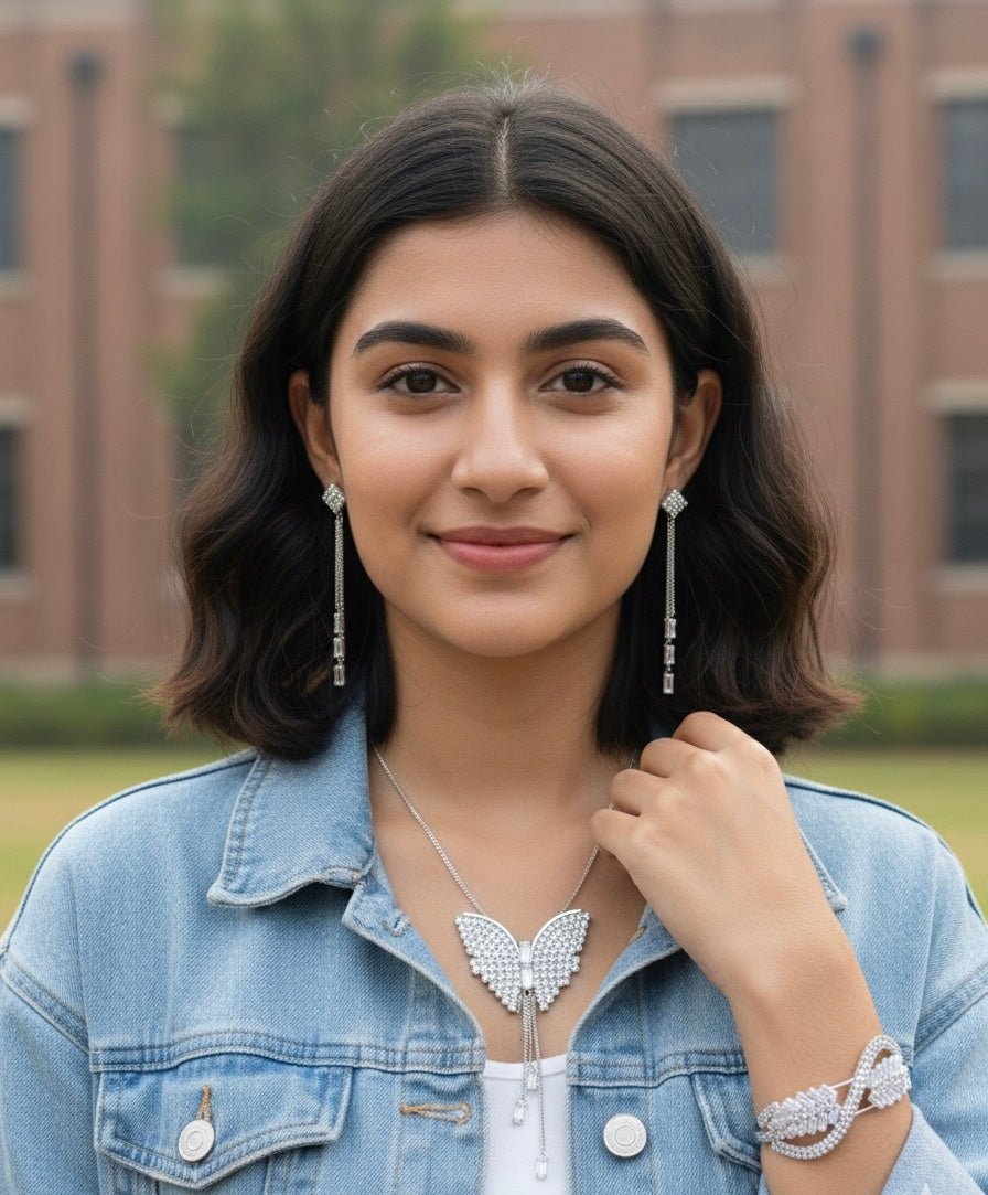 This premium butterfly design jewelry set includes a sparkling necklace, elegant dangling earrings, and a matching designer bracelet. Each piece is crafted from high-quality alloy with a crystal-studded butterfly motif and delicate tassel drops, giving a luxurious and fashionable look.