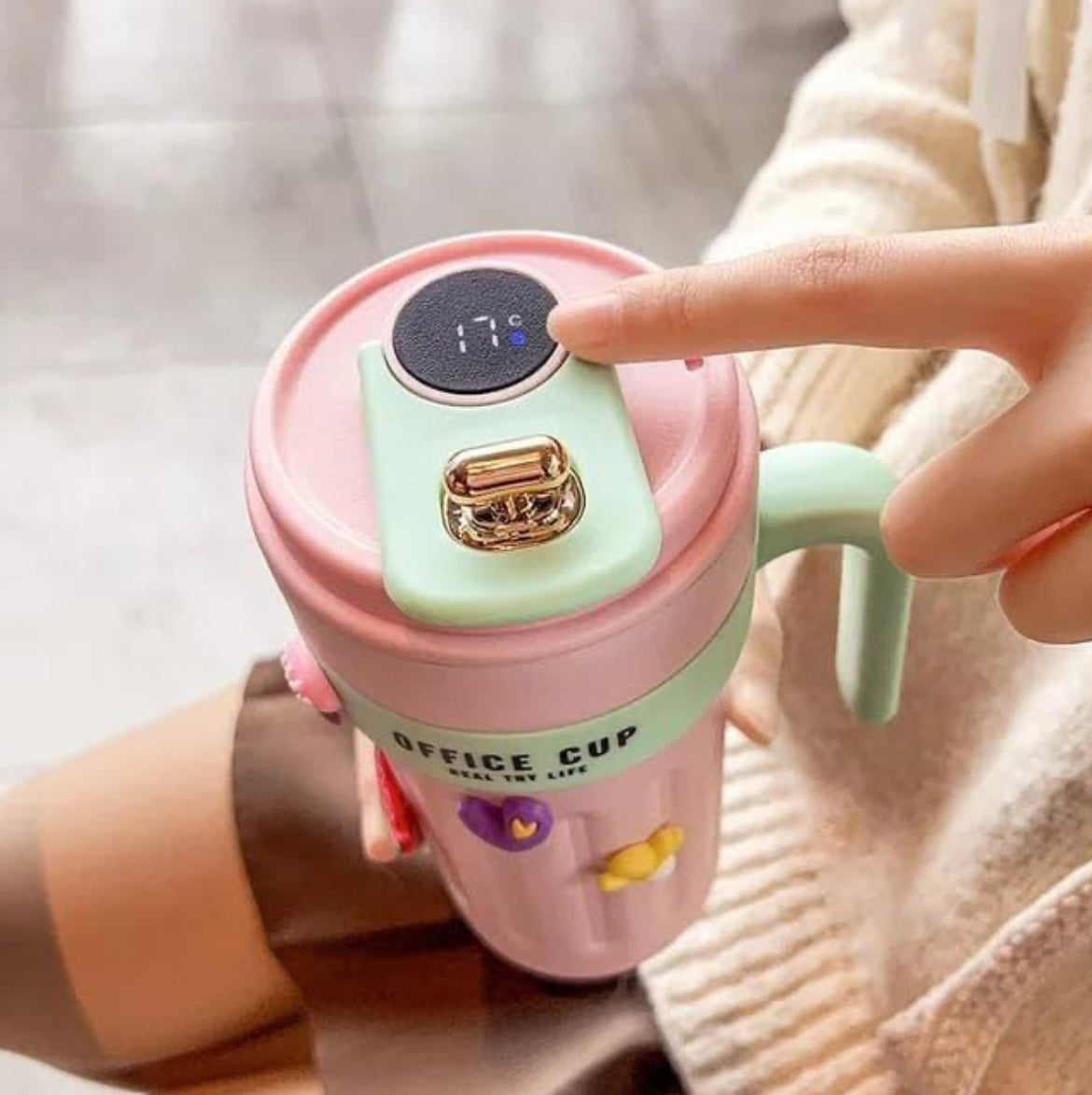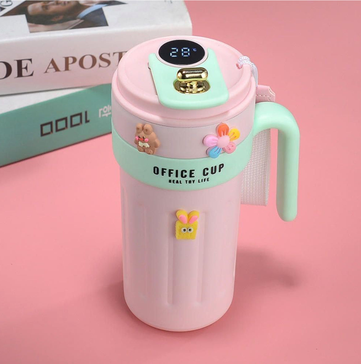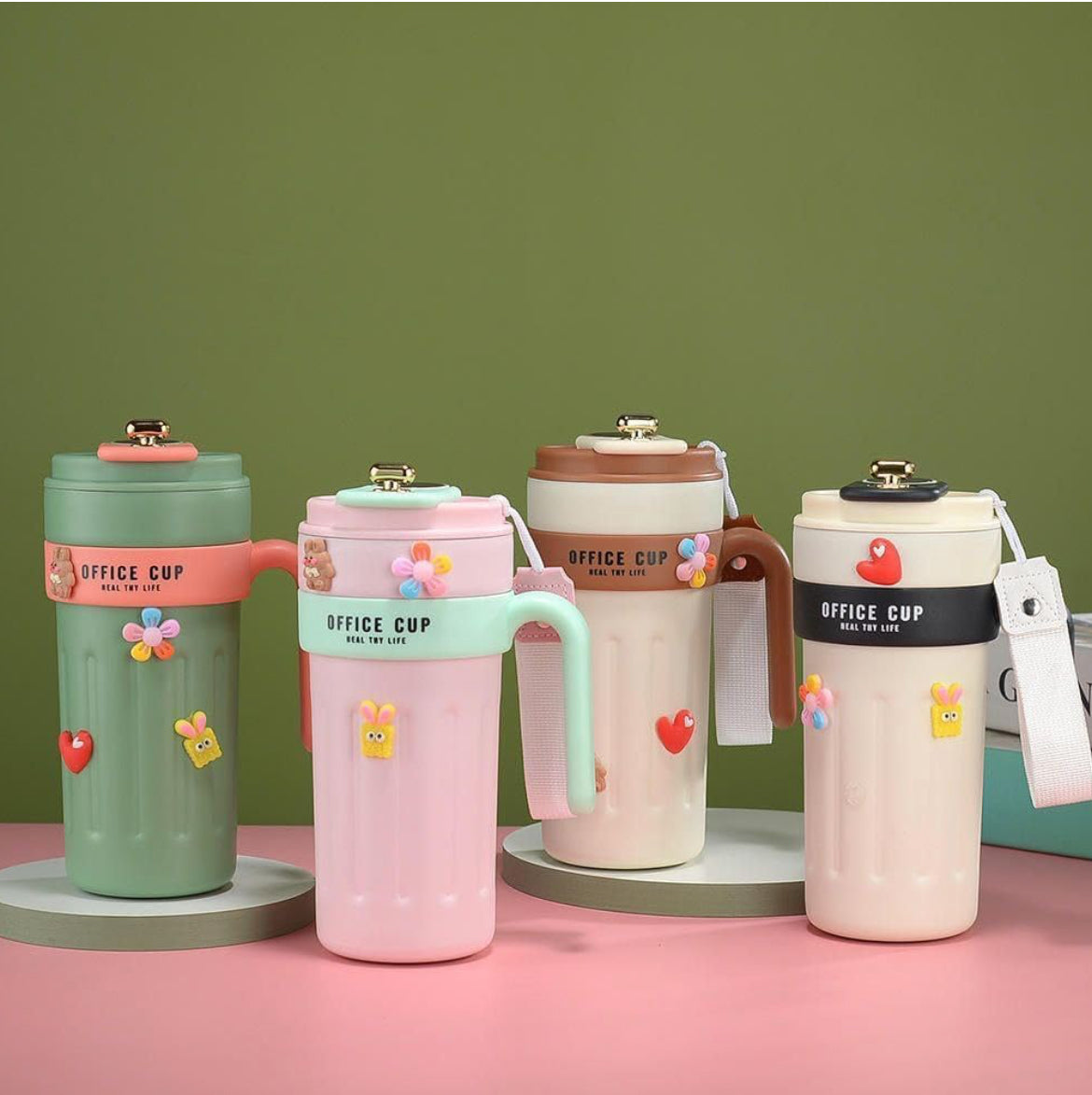 The cup comes with a comfortable side handle, secure lock-buckle lid, and cute 3D decorative charms — making it perfect for school, office, travel, college, and gifting.