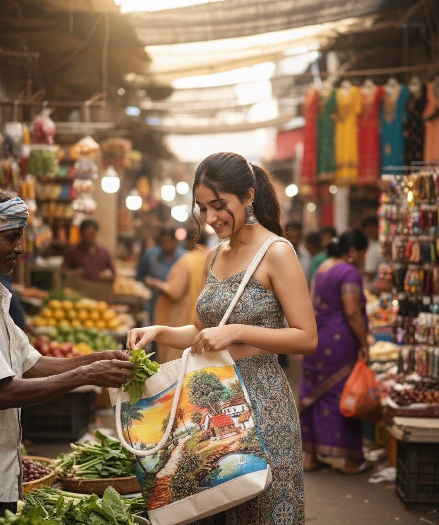 Carry a beautiful, vibrant piece of art with you. This striking canvas tote features a detailed print that looks like a rich oil painting, capturing a warm and engaging scene of traditional Indian village. The artwork depicts a communal gathering—perhaps a rest stop, a marketplace, or a family preparing a meal—full of narrative depth and cultural charm.